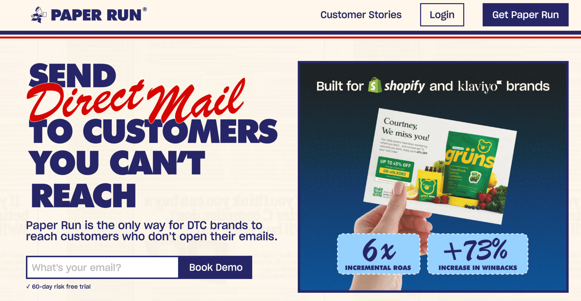 Learn more about Paper Run, and connect with them here to test direct mail for your brand. Refundable for the first 2 months. If you aren't happy, Paper Run offers a full refund, no questions asked.
